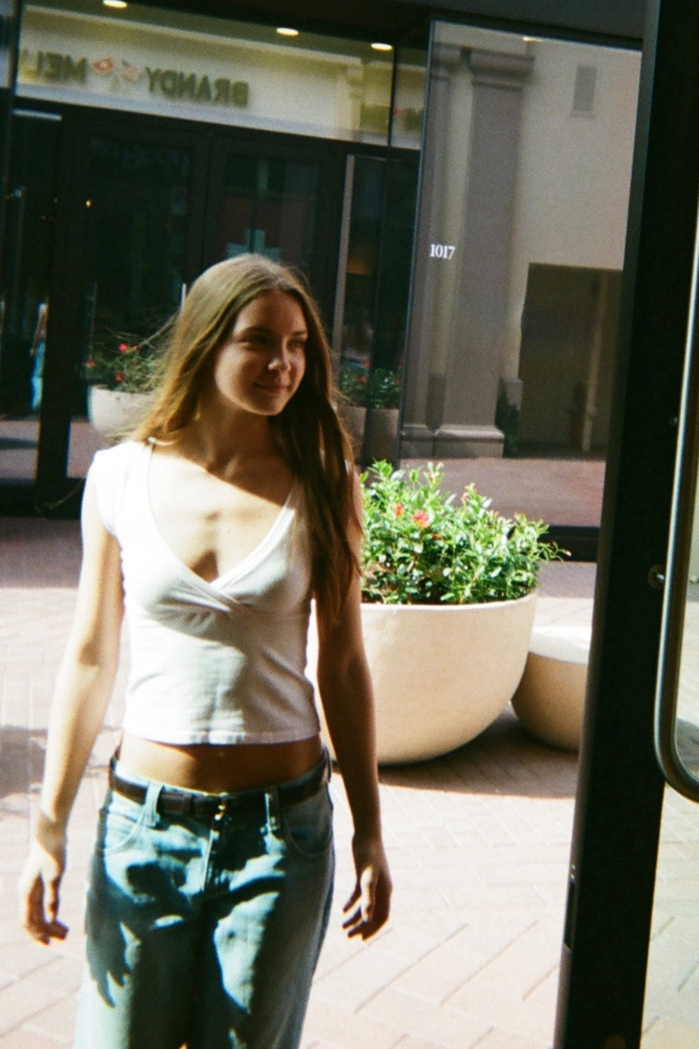 Product Photo - Description of the product. Cotton blend crossover scalloped v-neck tank top with a seam under the bust.Fabrics: 96% cotton, 4% elastaneMeasurement: 13.5" (34 cm) length, 12" (30 cm) bustMade in: Italy