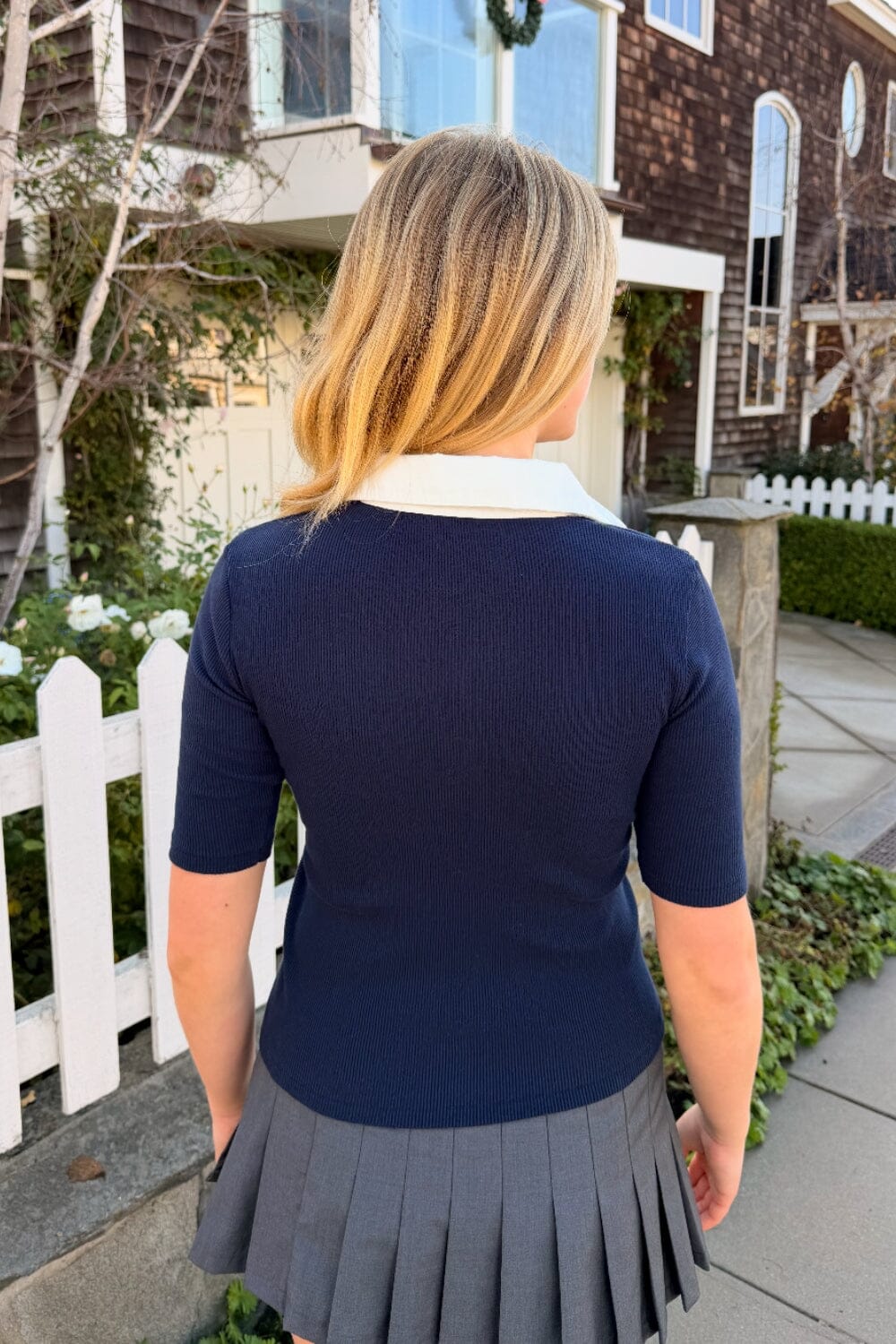 Navy blue ribbed knit top, fitted to the body with short sleeves, white shirt collar.